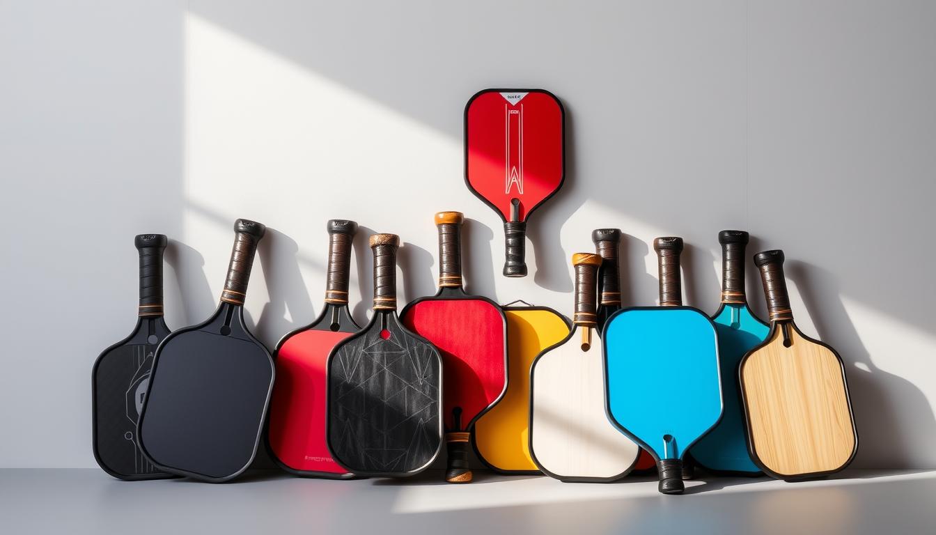 A collection of pickleball rackets in various styles and colors, arranged in a visually appealing layout against a plain, neutral background. The rackets are illuminated by soft, natural lighting that casts gentle shadows, highlighting their unique textures and designs. The image captures the diversity of pickleball racket options, inviting the viewer to closely examine the different models and consider how they might complement different playing styles and preferences.